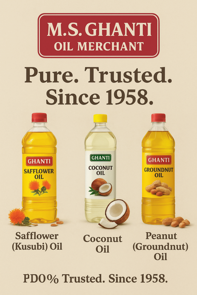 M.S. Ghanti Oil Merchant is one of Kalaburagi’s most respected names in 100% pure edible oils, offering Safflower (Kusubi) Oil, Coconut Oil, and Peanut (Groundnut) Oil.